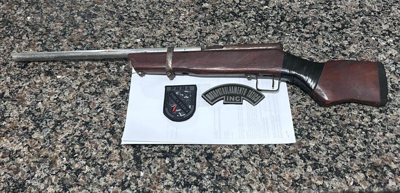 A equipe agiu rápido e interceptou o suspeito. Durante a busca pessoal, foi encontrada com ele uma arma longa de fabricação artesanal (tipo antecarga).